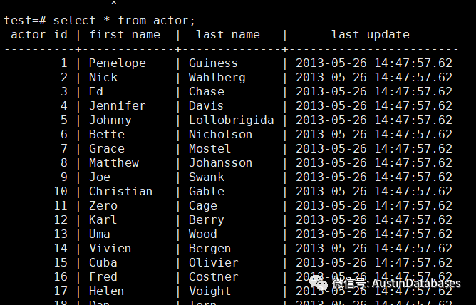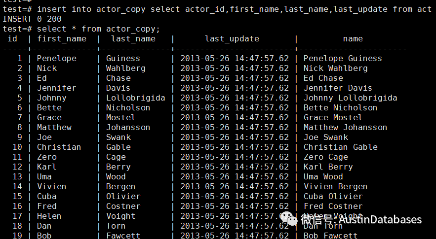 然后我们将数据灌入到 actor_copy 表中,然后查看表,可以看到多了一列并且这一列实际上是 first_name 和 last_name 的组合。那么name 这一列到底是怎么生成的。