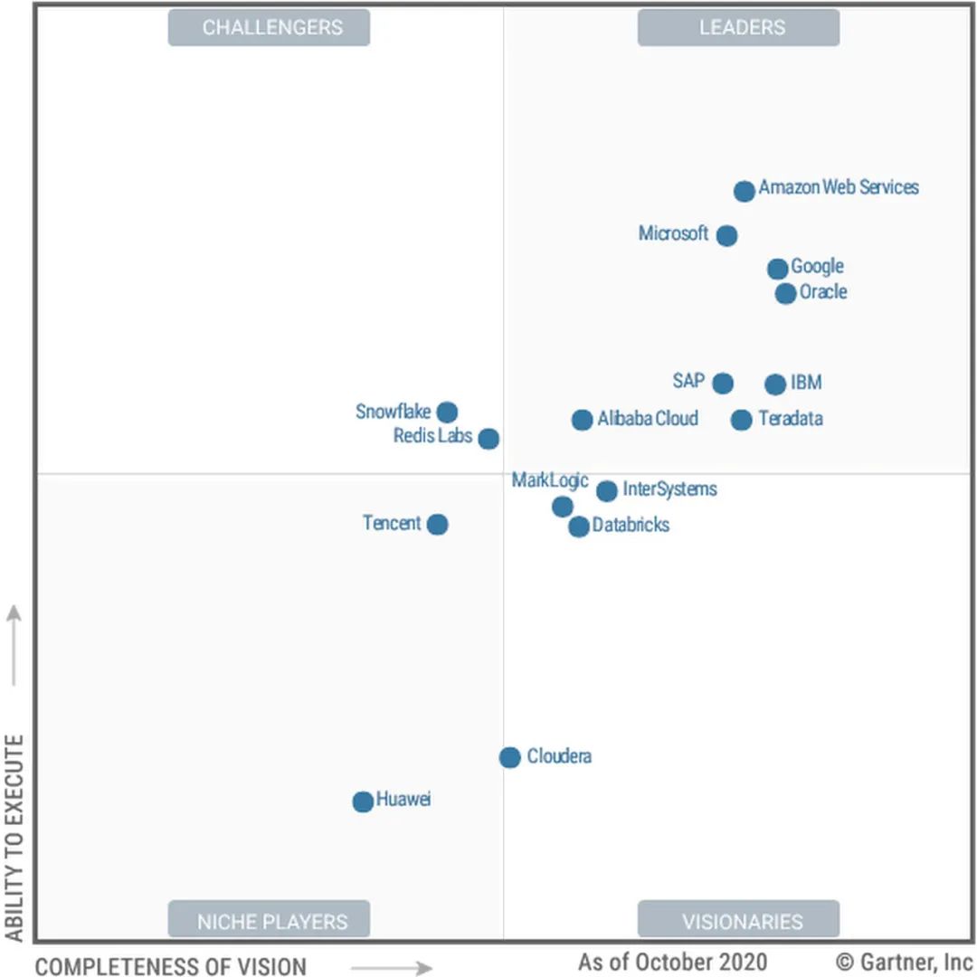 该市场不包括仅提供在IaaS(比如虚拟机或容器)中托管、由客户管理的DBMS的供应商。这个市场继续呈现出以下特点:云收入增长、云收入在DBMS总收入中的百分比提高,以及用户对本地产品的兴趣下降。这是Gartner的客户咨询服务得出的结果。Gartner的DBMS市场数据和Gartner的2020年企业公共云部门数据显示,DBMS市场总收入为648亿美元,其中262亿美元来自云DBMS产品(占整个DBMS市场的40%)。更为重要的是,在DBMS总收入增长的95亿美元中,云DBMS这部分贡献了88亿美元(占DBMS总收入增长的93%)。Gartner预测,到2022年,云DBMS收入将占DBMS市场总收入的50%,比2020年预测的提前了一年。今年魔力象限的顶部和右侧有大块空白,表明仍有改进的空间。提供多云、互联云和混合云的功能已非常先进,但并非所有供应商都能提供这三种云,也并非每种云都做得一样好。此外,云DBMS对元数据的处理变得更重要。需要元数据来帮助发现数据,并了解数据的使用、治理、安全、沿袭和质量,并作为更多增强型数据管理功能(包括优化)的基础。很显然,元数据将不仅仅由集中式专用工具控制,DBMS将更多地参与到元数据的处理中。这将有助于实施数据结构和数据治理。总体而言,其他市场将以更具创新的方式充分利用元数据。预计云DBMS会日益关注这个方面。供应商最初向云迁移的举动现已接近尾声,现在的动向更多地是利用云。云原生供应商一开始提供简单的云产品,现在通过提供更复杂的功能来扩展云产品。同样,总的来说,传统的本地供应商如今已成功地转移到云。它们旨在融合功能丰富的易于使用又可靠的云服务。CSP在一定程度上认识到客户需要云之间的协同操作,但这尚未普及,也不是所有用途和场景都需要的。对于分析型用途的DBMS而言,需要满足一个高标准。有效的SQL处理、与数据湖集成以及与AI和机器学习集成现在司空见惯。这样一来,新进入者更难进入市场。此外,随着CSP丰富壮大功能集,ISV保持差异化优势并因而维持增长面临挑战。在分析型数据库领域,数据共享概念已普及开来,多家供应商拥有产品或发布了公告。虽然使用数据库共享数据这个概念本身不是什么新鲜事,但新一代数据共享功能使组织可以轻松地在数据市场内打包和销售数据,并让消费者而不是发布者承担访问成本数据并将其与自己的数据集成的成本。基本功能对竞争对手而言不难复制,我们预计大多数大型供应商会提供这些功能。然而,尚不清楚用户组织会希望采用特定技术来访问数据,而不是采用更加类似开放系统的方法——Apache软件基金会已经至少在开展这种类型的一项计划。此外,几家供应商拥有重要的专有数据集或者拥有现成的一批客户,他们将构成一个天然的市场。可能会出现多个相互关联的市场。针对操作型DBMS,传统的联机事务处理得到了很好的服务。批式事务处理已成为 Spark的一种用途,特别是数据湖软件中拥有更强大的功能,比如实现湖仓一体(Lakehouse)的那些系统。另一个值得注意的OPDBMS趋势是,出现了分布式数据库管理系统(DDBMS)。目前,这些数据库针对非常特殊的大规模需求,或面向中国这样的庞大区域市场。然而,随着时间的推移,这些数据库可能会进入主流,更加本地化的系统只是将所有DDBMS组件和数据集中在一个位置,但能够跨多个位置和云随意扩展,或随意移动到其他位置,然而,就目前而言,主流的非分布式DBMS将继续能够满足大多数组织的要求。开源软件API的影响力越来越大。大多数云供应商为流行的开源数据库管理系统 (OSDBMS)提供服务,尤其是PostgreSQL和MySQL。更值得关注的是,几家供应商(包括CSP和独立供应商)提供的DBMS拥有与PostgreSQL或MySQL兼容的API,但它们自己的后端具有高度可扩展性。其中一些还旨在提供事务型处理和分析型处理的混合型处理。向数据生态系统迈进的趋势仍在继续。数据生态系统出现在这种环境下:提供商不仅在针对特定服务(比如数据仓库、数据湖或机器学习)的单点解决方案上展开竞争,还在集成多项服务的方上展开竞争,从而使它们很容易被一起使用。这个趋势可能愈演愈烈,不过与此同时,一些供应商会继续在同类最佳解决方案的基础上展开竞争。最后,值得一提的是,除了提供许多服务的大型组织外,还有许多供应商致力于提供一组特定的功能,就注重这组功能,并且做得很好。其中一些供应商多年来一直在市场上提供解决方案,或者可能是所在领域的创新者。如果最终用户组织希望获得这些供应商提供的特定功能,它们可能是不错的选择——重要的是供应商及其产品适合用户组织的实际需求。腾讯之所以被淘汰,是因为其业务主要聚焦国内。在海外拓展上,它没有达到Gartner的市场动能门槛。