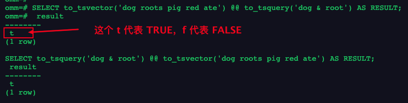 SELECT to_tsvector('dog roots pig red ate') @@ to_tsquery('dog & root') AS RESULT;