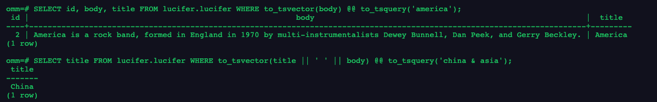 SELECT title FROM lucifer.lucifer WHERE to_tsvector(title || ' ' || body) @@ to_tsquery('china & asia');