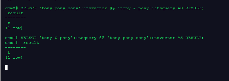 SELECT 'tony pony sony'::tsvector @@ 'tony & pony'::tsquery AS RESULT;