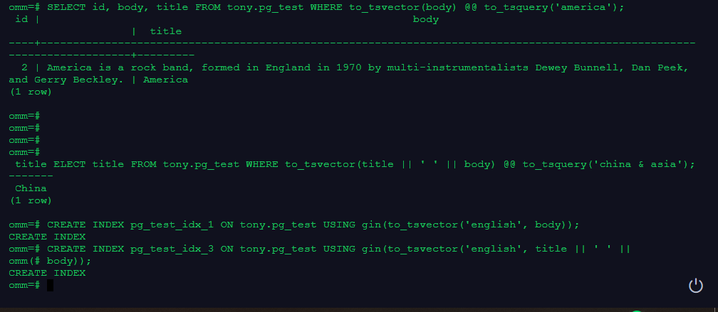 CREATE INDEX pg_test_idx_1 ON tony.pg_test USING gin(to_tsvector('english', body));