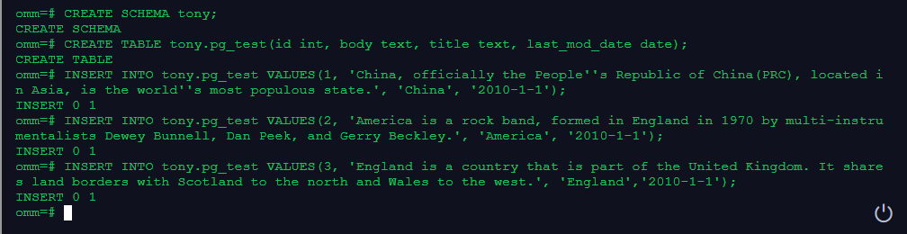 INSERT INTO tony.pg_test VALUES(3, 'England is a country that is part of the United Kingdom. It shares land borders with Scotland to the north and Wales to the west.', 'England','2010-1-1');