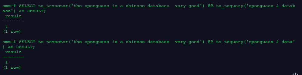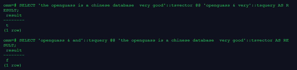 SELECT 'the openguass is a chinese database very good'::tsvector @@ 'openguass & very'::tsquery AS RESULT;