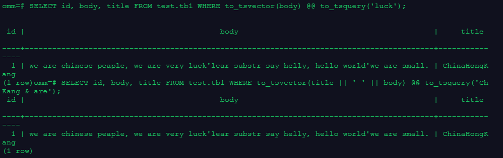 SELECT id, body, title FROM test.tb1 WHERE to_tsvector(title || ' ' || body) @@ to_tsquery('ChinaHongKang & are');