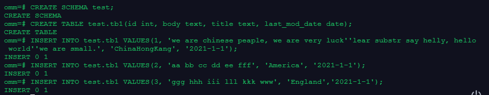 INSERT INTO test.tb1 VALUES(1, 'we are chinese peaple, we are very luck''lear substr say helly, hello world''we are small.', 'ChinaHongKang', '2021-1-1');