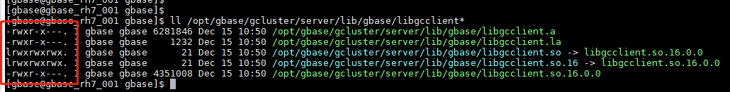 查看文件的权限,发现有x权限,且属主也是gbase:gbase