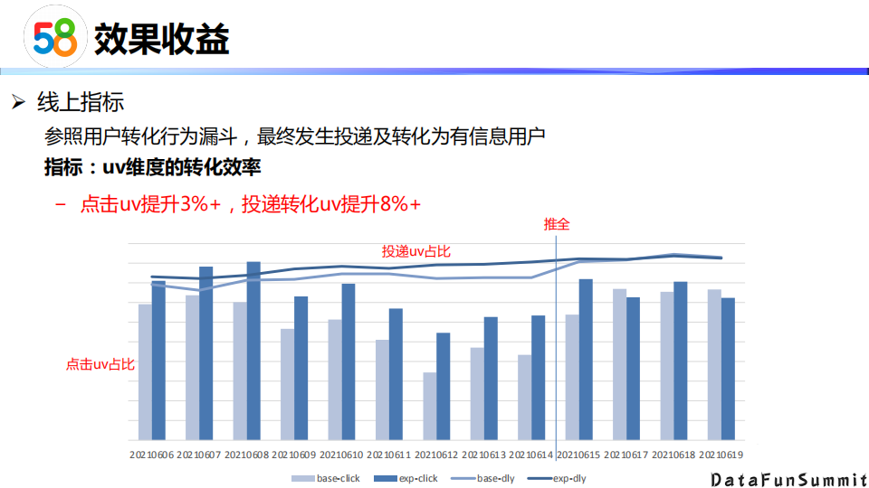 A:我们关注的重点是以业务为导向的,即我们关注用户能否在我们的平台上留下来。而平台主要的一些连接贡献是老用户产生的,不适合作为评估指标。所以我们更加关注新用户是否对我们平台具有好感,进而使得用户进行转化。这对应着uv维度的转化效率,即加入策略后所有新用户中能够多多少人产生点击行为,能够多多少人发生简历创建和投递行为。