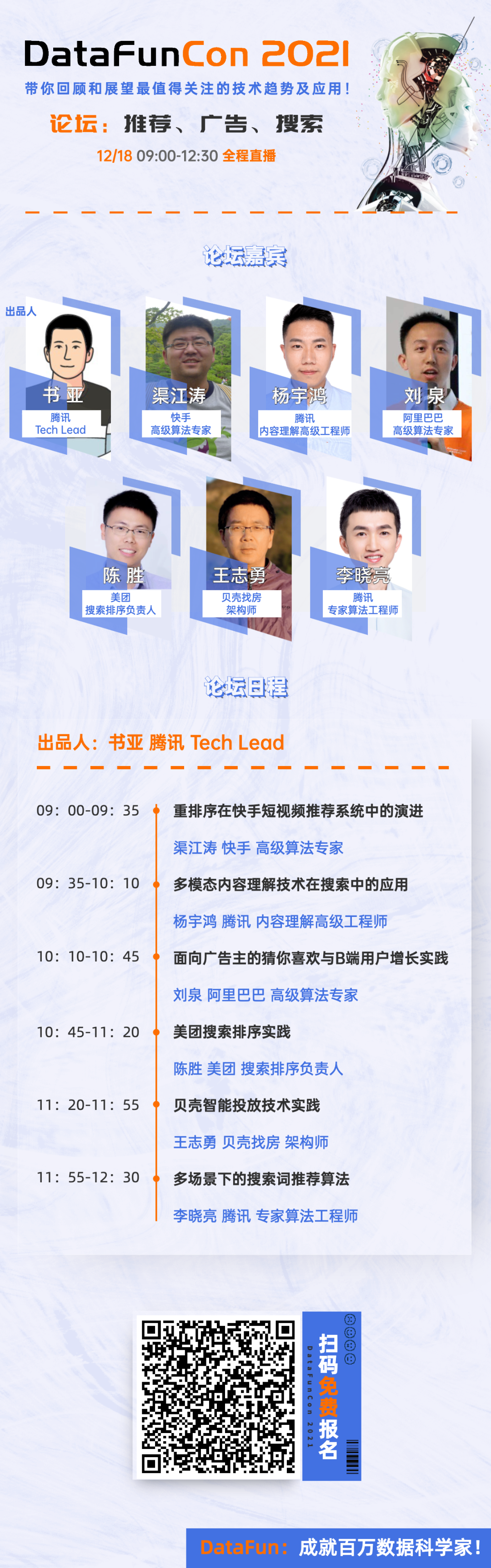 12月18日,9:00-12:30,在DataFunCon大会上,由腾讯Tech Lead书亚老师出品的推荐、广告、搜索论坛,将与大家见面,届时我们将为大家带来互联网核心应用算法的最新实践探索!