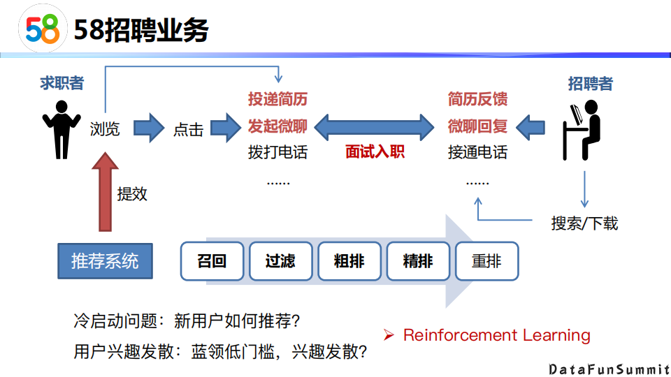 导读:58招聘是国内最大的蓝领招聘平台,是58集团的四大核心业务之一,每天有着上千万的职位在平台上发布,同时也有百万量级的求职者在平台上进行简历投递,达成海量连接并促进大量的成功就业。招聘业务是一个典型的双边匹配任务。我们会向B端客户(招聘者)连接C端的用户(求职者)。与业界其他推荐系统相比,58职位推荐面临着更明显的冷启动问题以及蓝领用户兴趣发散的问题。本次分享想跟大家讨论我们针对以上问题使用强化学习的模型设计与应用实践。
