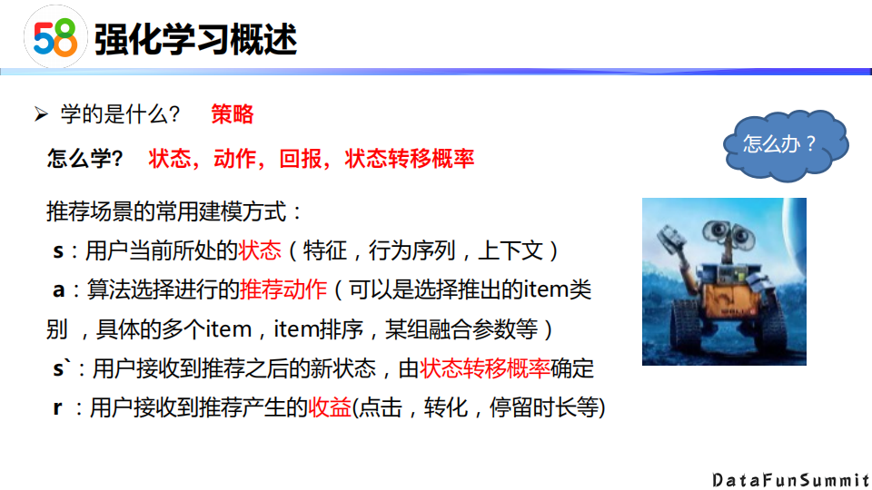 a(动作),在推荐系统中对应着为了解决一个问题我们算法选择的推荐动作,它可以是选择推出的item类别(职位类别),具体的多个item(具体职位),item排序,某组融合参数等。我们要解决什么问题,就会把相应的一些问题定义成action;