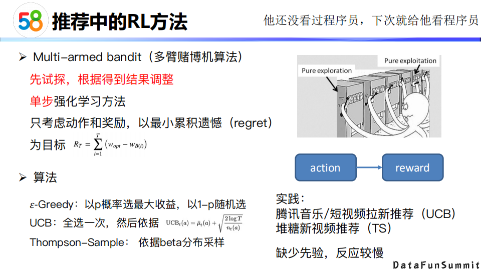 首先考虑最简单的情况。比如说一个求职者没有看过程序员这个职位,我下次就给他推荐程序员试试看。相反地,如果他已经看过很多次程序员这个职位,我下次就不给他推荐程序员。这个思路本质上就是先试探,根据得到的结果进行相应的策略调整。这其实就是MAB(多臂老虎机)算法。整个算法模型是由一个动作来决定一个回报,即只考虑了动作和奖励,并以最小累积遗憾为目标。累计遗憾就是每个步骤中采取的一个方案与最优方案之间的差值,这个差值越小就代表目前的一系列决策行为是越好的。