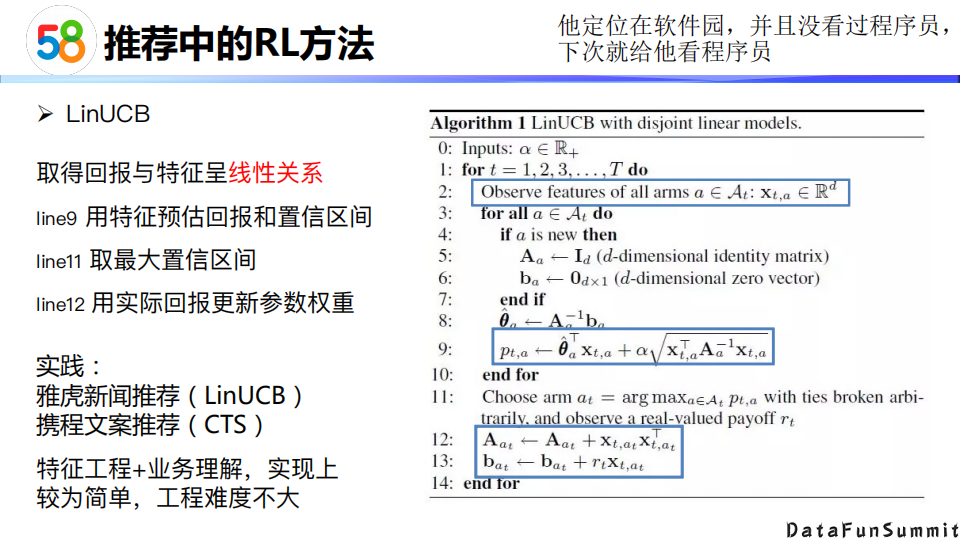 下面对线性UCB算法进行一个简单的介绍。线性UCB算法假设取得的回报和特征是呈线性关系的,也就是说我们可以将其类比有监督学习中的LR算法来进行理解。首先我们取得每个策略的特征,然后通过一系列计算得到每个策略对应的参数集合(相关样本的特征矩阵等)。在上图算法第9行中,线性UCB的前项实际上可以直接类比LR中W乘以X,即得到一个策略的期望收益,后项实际上就是探索-利用机制中的模型的预测方差(探索部分的分值),使得算法不能单纯贪心地选当前最大值,还可以探索之前没有选择或者选择次数比较少的一些策略。最后,算法通过线性更新来改变对应的权重。线性UCB算法的核心点主要在于特征工程的设计和相应的业务理解,其具体实现难度相对来说并不大,而且它在解决冷启动问题以及其他强化学习的问题上都有比较出色的效果。