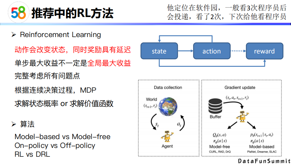 目前我们也是在探索完整强化学习问题在职位推荐的应用。还是拿之前的例子来说:如果一个人定位在软件园,且一般看三次程序员的职位后会选择投递,他之前已经看了两次该职位,那么下次就给他推荐程序员这个职位。相较于MAB方法,完整强化学习问题通过引入状态转变,使得算法能够学习到奖励延迟。在状态空间中只有部分状态是有奖励的,通过多个状态之间的相互转移,强化学习算法就可以学到单步最大的收益并不一定是全局最大收益。