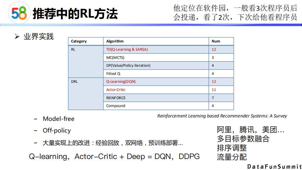 针对这三个特点,就带来了三个问题:难以建立环境模型、较低的计算复杂度以及算法收敛的稳定性与收敛速度。结合上文提到的强化学习方法划分大类,Model-free其实就是针对状态空间比较大的问题,我们不需要对状态空间进行刻画,而直接刻画值函数。而off-policy是指每一步迭代,我们可以使用之前的一些经验来加快收敛速度。这两种方式都非常符合推荐场景的特点,目前业界已经提出了对model-free off-policy模型的改进策略,代表方法有经验回放、双网络、预训练部署等。