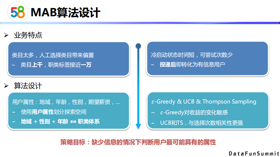 具体算法设计需要基于业务的特点。对于招聘来说,类目体系的数量达到千级,如果结合标签体系则可以接近万级。类目数量巨大导致我们没办法直接根据职位类目设计桶,因为这导致动作空间过于庞大。另外,我们要解决的是冷启动问题,但用户发生投递后便会创建简历,转化为一个有信息的用户,这导致了冷启动用户状态时间短,推荐系统可以尝试的次数比较少。