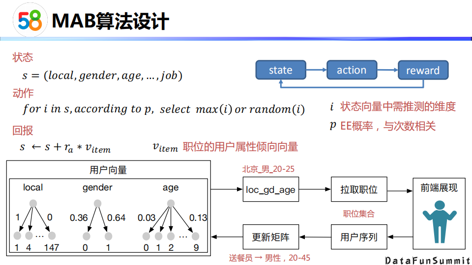 举个简单例子,图中给出一个用户向量,它包含了用户的三个属性(地域,性别,年龄)。用户的定位在北京;性别0代表男性1代表女性,图中0.36代表其男性的概率是0.36,对应女性的概率是0.64;年龄上分为十个区间,也对应着相应的概率取值。通过这三个属性,我们使用epsilon-Greedy算法进行职位属性选择,得到了北京、男性20-25岁这个确切的职位属性。之后会拉取属性下对应的职位进行前端的展现。最后根据用户序列,即用户点击过的职位集合(如送餐员),通过一个权重矩阵来对职位属性进行对应的更新,在这个例子中代表送餐员这个职位男性20到45岁点击得比较多,该用户更可能具有男性和20-45岁的属性。最后把向量更新到用户的状态中。