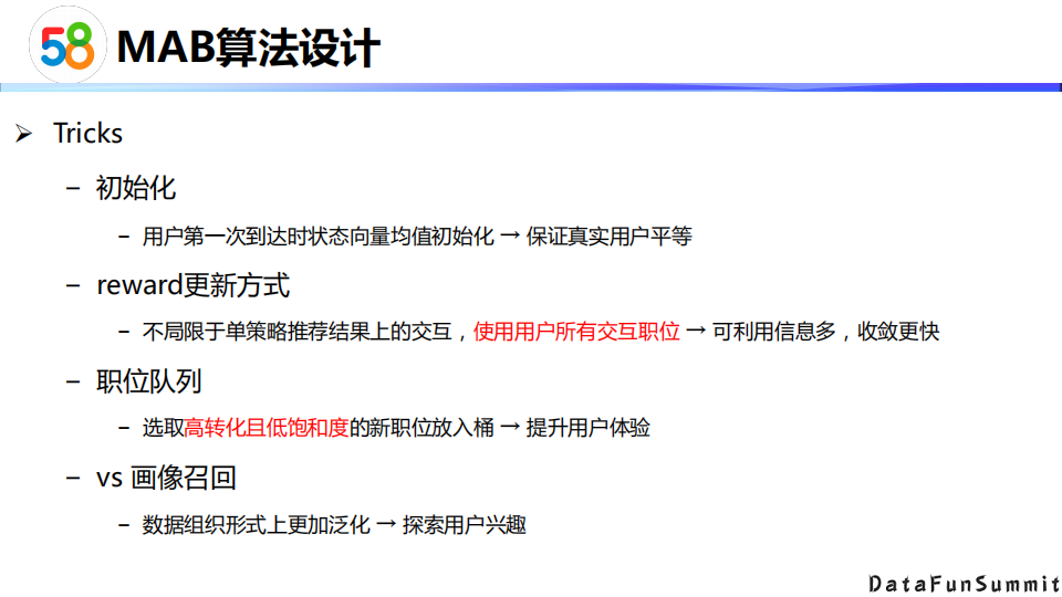 与画像召回的区别:画像召回也是利用用户最近的一些行为来拉取相应的职位。但是MAB算法的关键点在于我们在数据组织形式上更加泛化。画像往往就是用户最近点击的两到三个职位及其类别,而我们采用的方法对用户所处于的状态进行了泛化,例如北京、20-25岁的男性等。而对应的用户属性在我们平台上的职位是多种多样的。采用泛化的技巧,我们可以使推荐系统更好地探索用户兴趣。