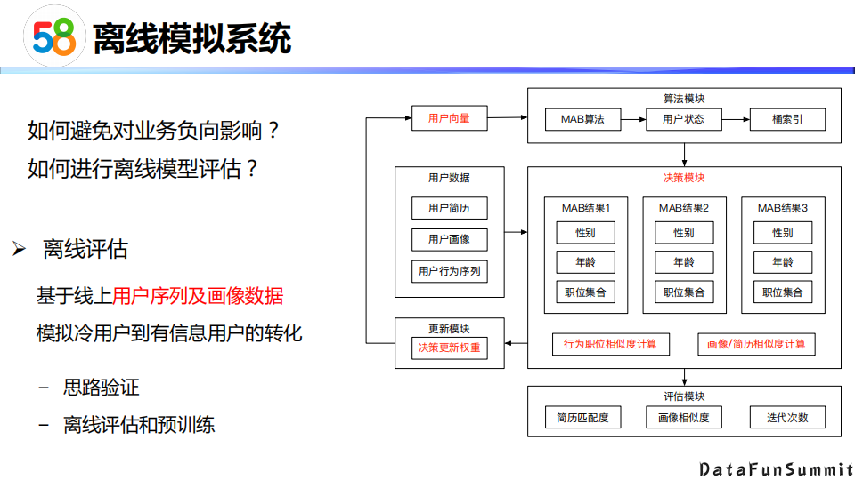我们通过使用线上真实的用户序列以及画像数据来模拟冷用户到有信息用户的转化,以此来达成我们的思路验证和离线评估以及训练的目标。整个系统大概由四个模块组成。首先是MAB算法模块,该模块根据前述的算法流程来模拟进行职位的推荐。最重要的模块是决策模块,负责将MAB算法的结果和用户真实数据进行计算。这部分进行了两部分计算,第一部分是对MAB推荐的职位和用户真实的行为序列进行相似度计算,通过设定相似度阈值的方法取相似度比较高的一些职位送到更新模块中来模拟用户点击了MAB算法推荐出来的职位,然后依照相应的权重对用户向量进行更新。另外一部分是将MAB试探的用户属性与用户真实的画像和简历进行相似度计算。通过这部分计算,我们可以得到简历匹配度、画像相似度等指标,并将这部分结果送到评估模块中。