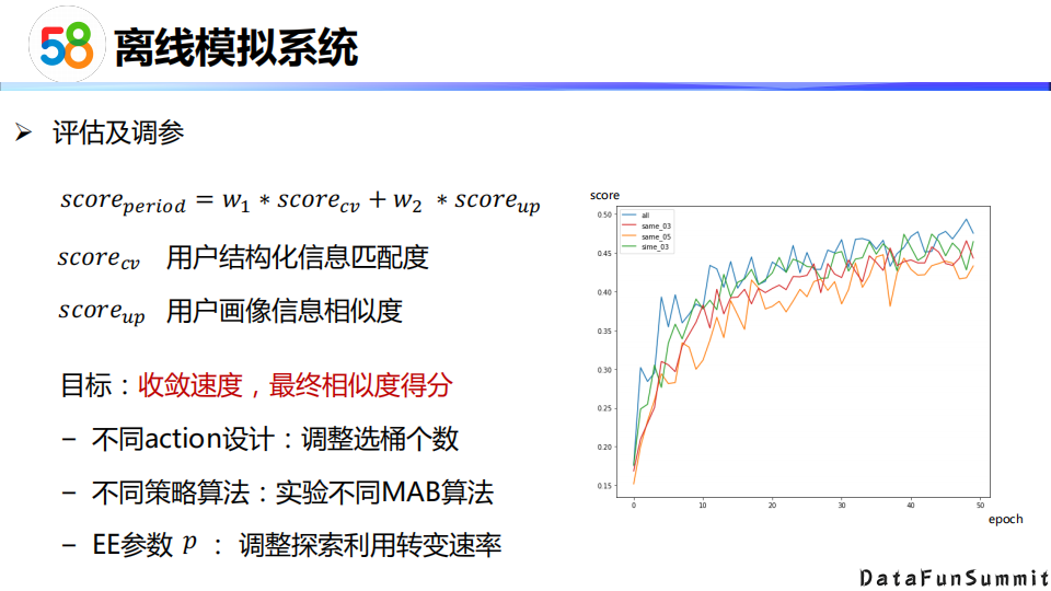 在离线评估及调参中,我们主要关注用户结构化信息的匹配度以及用户画像信息的相似度。结构化信息实际上就是用户的简历,我们希望推荐的职位与用户真实信息尽量匹配。用户行为画像主要是用户在平台上交互过的职位的职类信息。每一轮MAB算法推荐出来的职位的类别可以与两部分信息进行相似评分计算。最终的分数是两部分分数的加权和。