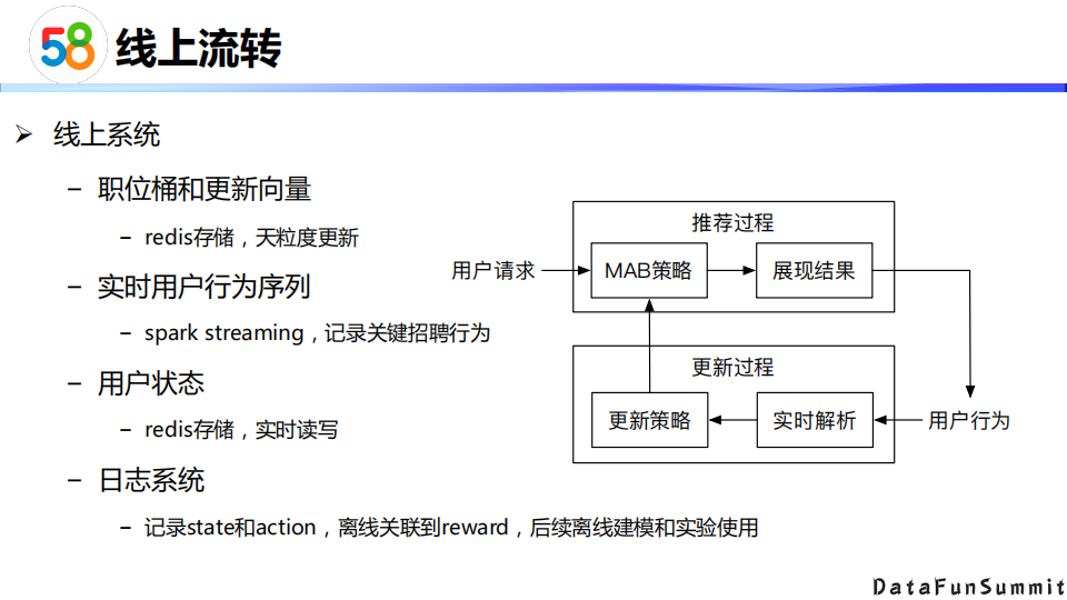 A:首先,针对用户属性和职位桶的映射关系的设计,我们基于群体画像的思路,也就是说我们会根据用户在平台上的一系列行为(点击、投递、IM电话等)以及用户侧的简历信息(包含地域、性别、年龄等),与职位类目体系进行关联分析。我们目前采用较为简单的聚类作为关联分析的方法,通过此来建立出不同用户属性到相应的职位类的映射,然后通过映射在线上进行更新。对于线上的参数,它的更新完全在线上进行。线上的参数由两部分组成:一个是模型本身的参数,主要是设计的算法使用用户的交互行为序列进行学习;另一部分是算法的超参数,比如探索-利用概率,以及桶的数量设置等,这部分参数是我们离线进行调试后再部署至线上系统,然后观察A/B实验的效果进行进一步调整,直至模型在A/B实验中效果比较稳定后便将其固定。