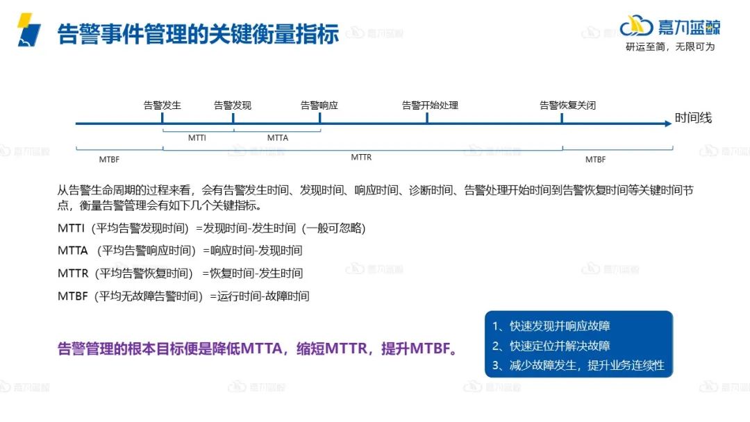 告警管理的根本目标是降低MTTA,缩短MTTR,提升MTBF,即快速发现并响应故障、快速定位并解决故障、减少故障告警发生,提升业务连续性。