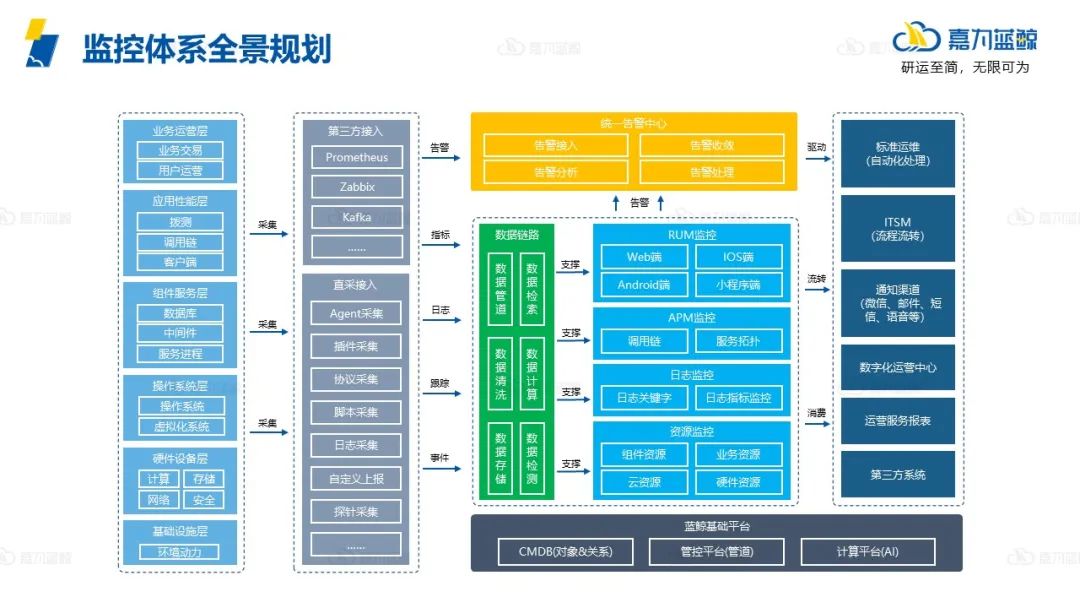 由统一的数据链路支撑,整体规划中会有资源监控、日志监控、APM监控、RUM监控四大监控场景,覆盖ITIM、Log、APM、RUM监控的整个体系,最后联动CMDB实现各个场景数据的互联互通。