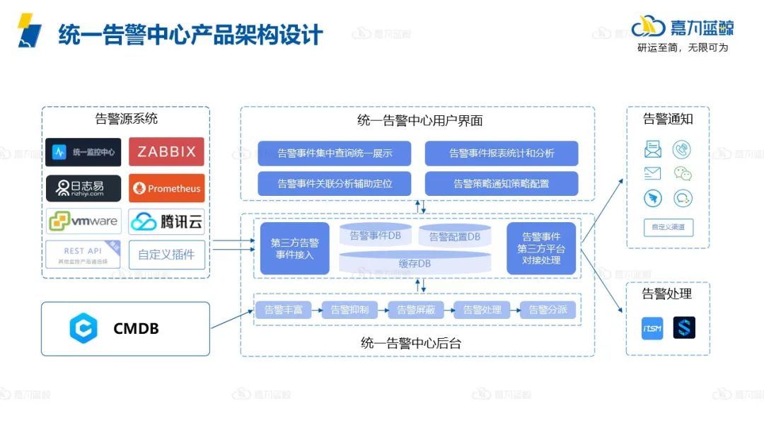 事件接入到统一告警中心后台处理,和CMDB做打通,进行告警信息的丰富,支撑后续的策略处理和告警分析。在告警事件的处理和分派阶段,和第三方系统打通,比如打通各种告警通知渠道进行告警通知,打通自动化平台实现告警自愈,和流程平台打通实现告警自动派单等。