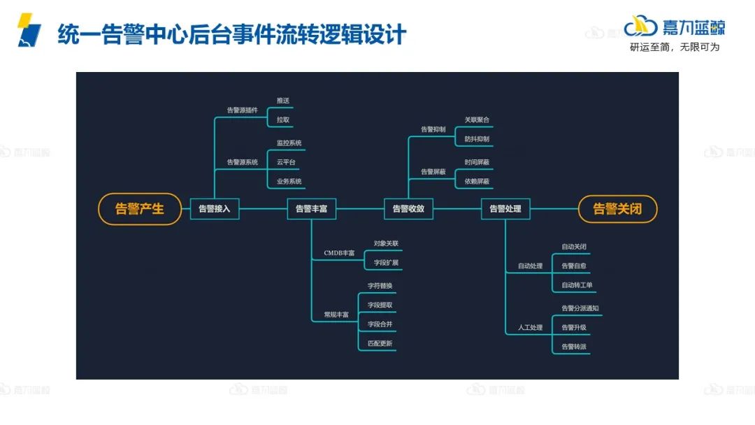 其中分析涉及到和CMDB的打通联动,丰富告警事件去支撑分析。对处理来说,最关键的点是告警管理过程中的流转,无论是流转到IT工单系统里做协同还是通知到人等都是一个流转的过程。