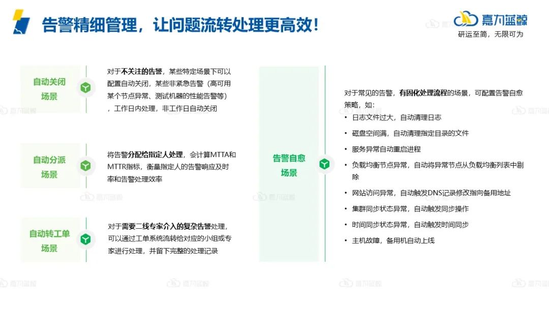 主要体现在4大场景:自动关闭场景、自动分派场景、自动转工单场景和告警自愈场景。
