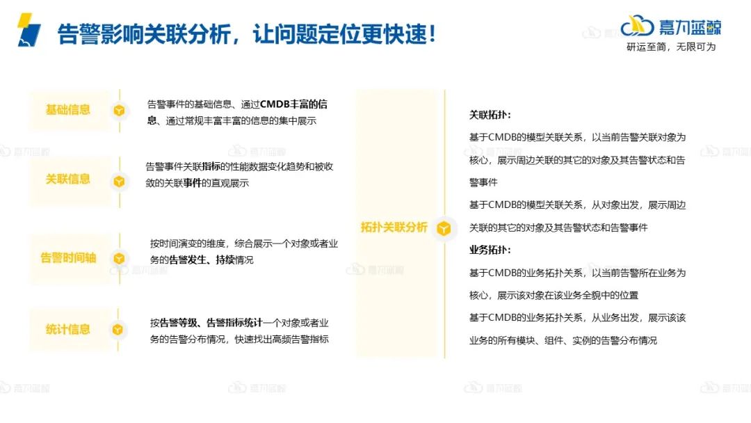 针对告警分析相关的场景,通过基础信息、关联信息、告警时间轴、统计信息、拓扑关联分析,让问题定位更加快速。