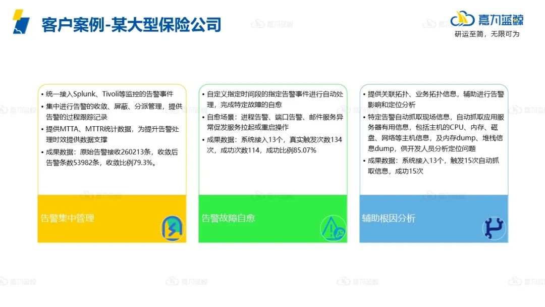 某大型保险公司,通过使用我们的告警中心,实现了三种应用场景:告警集中管理、告警故障自愈和辅助根因分析。