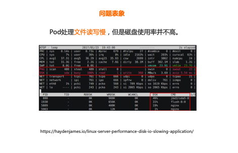 节点本身的 IO 高影响 Pod,节点的 IO 是共享资源,部分高 IO 的 Pod 可能影响其他 Pod;