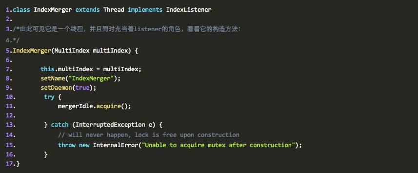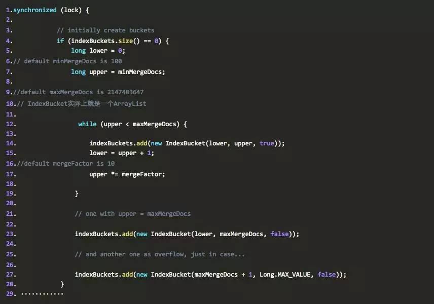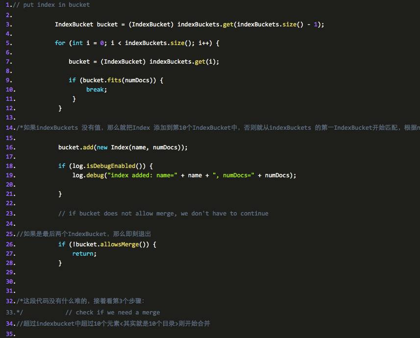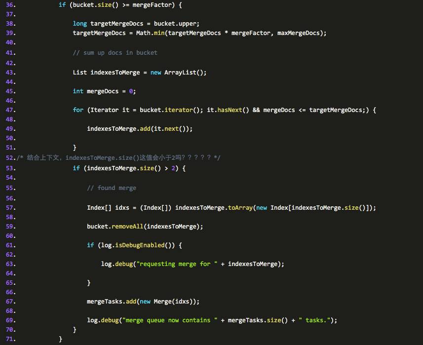 在创建完 IndexMerger ,那么就有可能把 PersistentIndex 加进来了,因为 Merger 类必须知道哪些 PersistentIndex 是需要 Merger 的,那么我们看看负责这段逻辑的代码:这段代码主要负责 3 个功能,一个是初始化 indexBuckets ,这个一个 ArrayList ,其中放的是需要 Merger 的 PersistentIndex 的列表,也就是我们可以认为 indexBucket 里放的还是 list ,这里有一个非常奇怪的设计,就是在初始化的时候将 PersistentIndex 按照 docnums 的范围分组了,一组就是一个 indexBucket 。