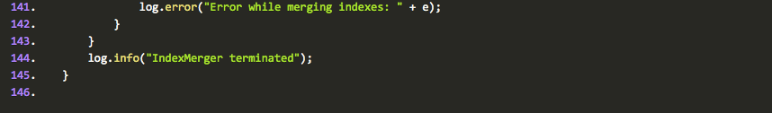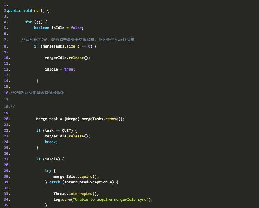 显然,这里又用到生产消费模型,任何调用 indexAdded 方法的都属性生产者,生产者根据一些条件,有选择的把需要合并的 persistentindex 放到 mergeTasks 的队列中,有了生产者肯定存在消费者,文章开头提过, IndexMerger类是一个 deamon 线程,看看它的 run 方法,那么就发现,其实它就是消费者。它主要完成以下几个功能: