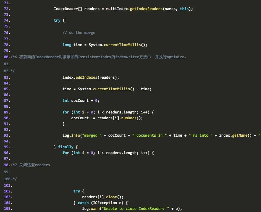 在前面的文章中,我们可以看到一次索引创建的操作,可能会产生多个 persistentindex 对象,而这些对象其实代表着一个索引目录。随着创建索引的次数越来越多,那么索引目录也在增多,但是索引目录中的数据却不是很多,所以我们需要把多个目录合并,其实也就是索引的合并。