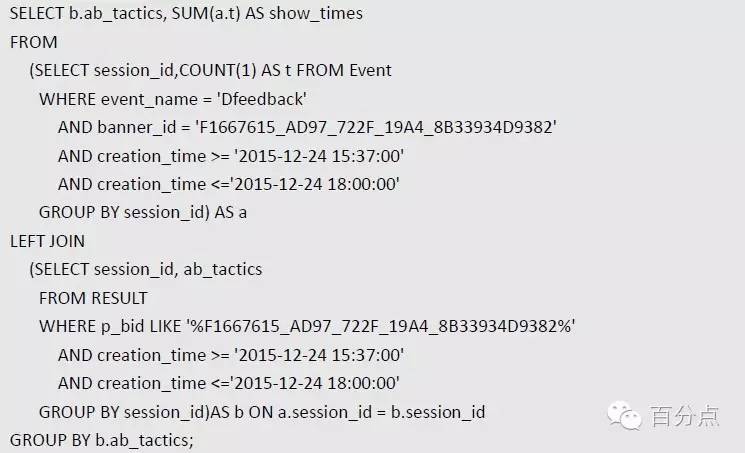 在百分点,每天有10亿条记录产生,针对这些大量实时产生的数据,不仅要做到实时写入,类似推荐调优、数据验证等查询要在秒级响应。有简单的单条验证,也有几个小时或一天的聚合计算,也有基于几千万/几亿数据表间的联合聚合查询。例如如下SQL查询: