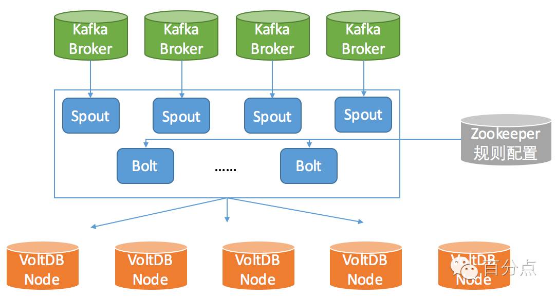 使用Storm分布式实时计算框架,作为VoltDB的客户端,同时也是Kafka的消费者,充分利用Storm框架的高可用性和低延时特性。从数据产生,到进入VoltDB,逐条写入延时在16ms内,如果优化成汇聚小batch写入,可以提升吞吐但降低写入延迟。