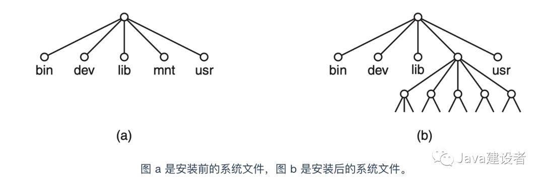 调用会将两个文件系统合并为一个。通常的情况是将根文件系统分布在硬盘(子)分区上,并将用户文件分布在另一个(子)分区上,该根文件系统包含常用命令的二进制(可执行)版本和其他使用频繁的文件。然后,用户就会插入可读取的 USB 硬盘。