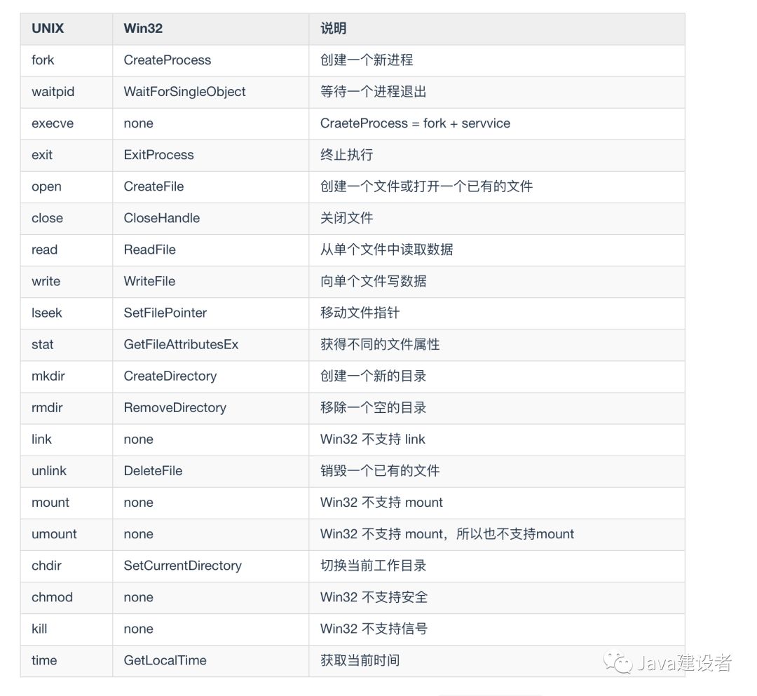 Win32 接口中没有文件的链接、文件系统的 mount、umount 和 stat ,当然, Win32 中也有大量 UNIX 中没有的系统调用,特别是对 GUI 的管理和调用。