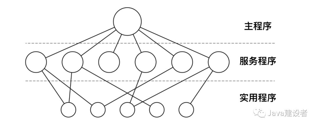 在单体系统中,对于每个系统调用都会有一个服务程序来保障和运行。需要一组实用程序来弥补服务程序需要的功能,例如从用户程序中获取数据。可将各种过程划分为一个三层模型