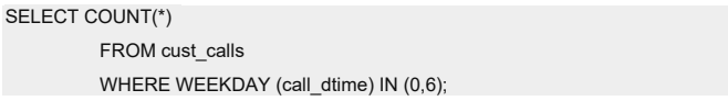 下列查询使用 COUNT 和 WEEKDAY 函数来对在周末收到的来电进行计数。此类语句能够