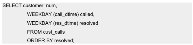 下列查询使用 WEEKDAY 函数来指示在星期几接收并处理来电(0 表示星期日,1 表示星