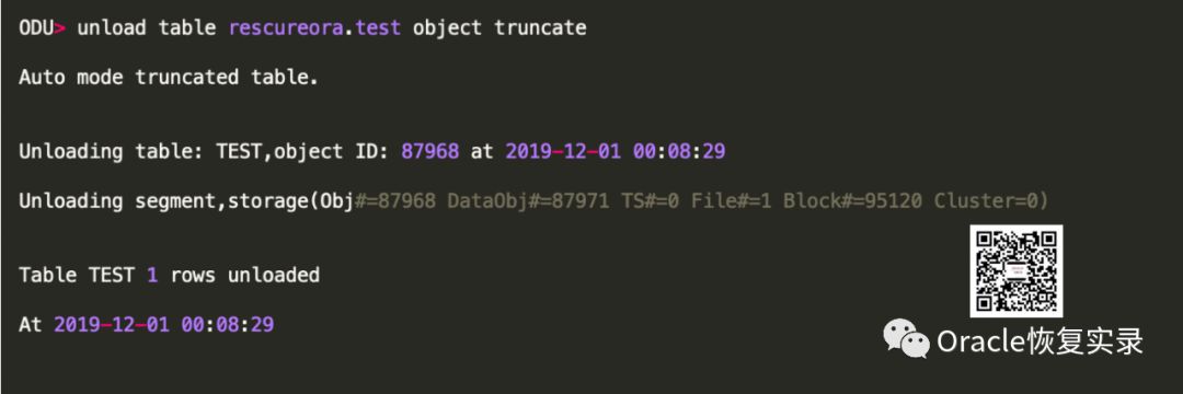这种方式的原理是读取tab.odu信息找到段头块,根据段头的extent map抽取数据,很明显这种方式不能用于恢复truncate。