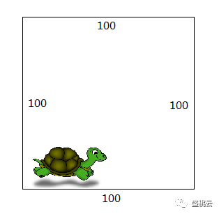 turtle.forward(100) 意思是让海龟前进100个像素,turtle.left(90)的意思是左转90度。然后多次重复前进100个像素和左转90度,最后海龟按我们的指令绘制出了一个正方形,可以想象一只海龟听从程序指令做了如下运动轨迹