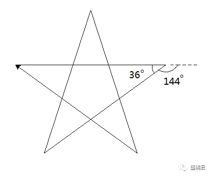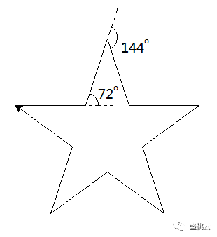 转到其他尖角的角度为 (180-36)/2 = 72 度,144还是按上一个五角星的公式计算得到(180-36=144)。