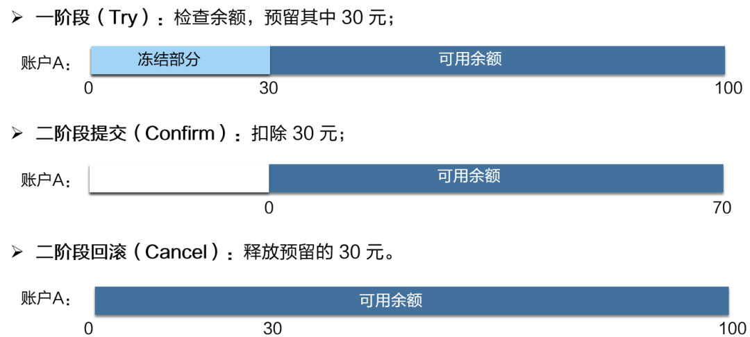 try-冻结30元,预留资源 --> confirm-扣款30元 --> cancel-退回30元。