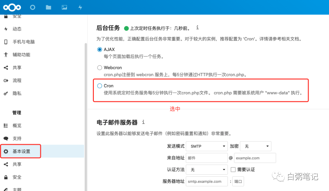 AJAX:调度方法是默认选项。不幸的是,它也是最不可靠的。每次用户访问Nextcloud页面时,都会执行一个后台作业。这种机制的优点是它不需要访问系统也不需要注册第三方服务。与Webcron服务相比,这种机制的缺点是它需要定期访问页面才能触发它。