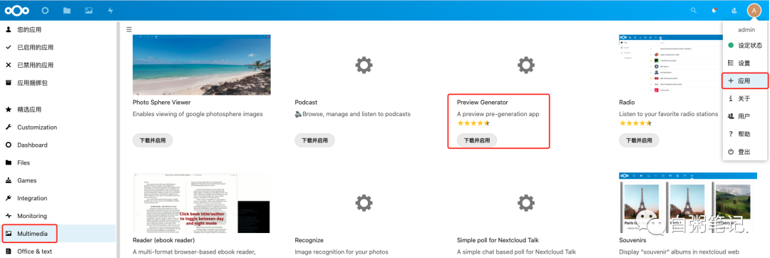Preview Generator是Nextcloud应用商店中提供的插件,可以提前生成图片的缩略图,提升系统性能,提高加载速度。