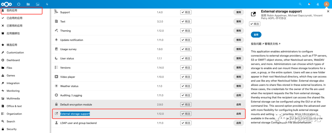 如果安装失败,我们根据提示,把对应的下载地址复制出来,通过其他方式下载之后,解压到nextcloud的 "/var/www/html/apps"**目录下,然后再回到应用安装界面,点击“启用”**即可。